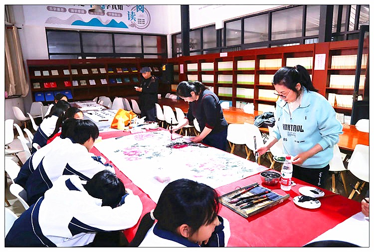 活动伊始,老年艺术家们在学校阅览室摆开长卷,铺陈宣纸,现场挥毫创作。浓淡相宜的墨色让观者仿佛置身春日花园。艺术家们或工笔细描、或泼墨写意,山水、花鸟、书法等作品相继诞生,每一幅都凝聚着他们对传统艺术的深厚造诣与热忱。 创作过程中,艺术家们不时向围拢的师生讲解技法要点,从握笔姿势到墨色调配,从构图技巧到意境营造,毫无保留地分享自己的经验。