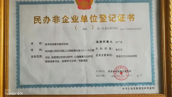 菏泽市硕博书画研究院,由菏泽市文化和旅游局与菏泽市行政审批服务局和菏泽市民政局共同批准成立,为民办非企业单位。业务范围为书法、绘画理论和技法研究,心理健康文化研究,网络信息书法、绘画学习交流,书画展览等。该院将利用硕士、博士的优势资源,拓展与书画文化相关联的书画研修班、企业文化培训咨询等 。