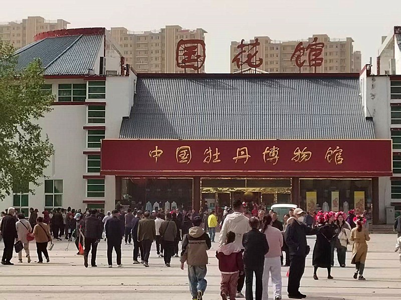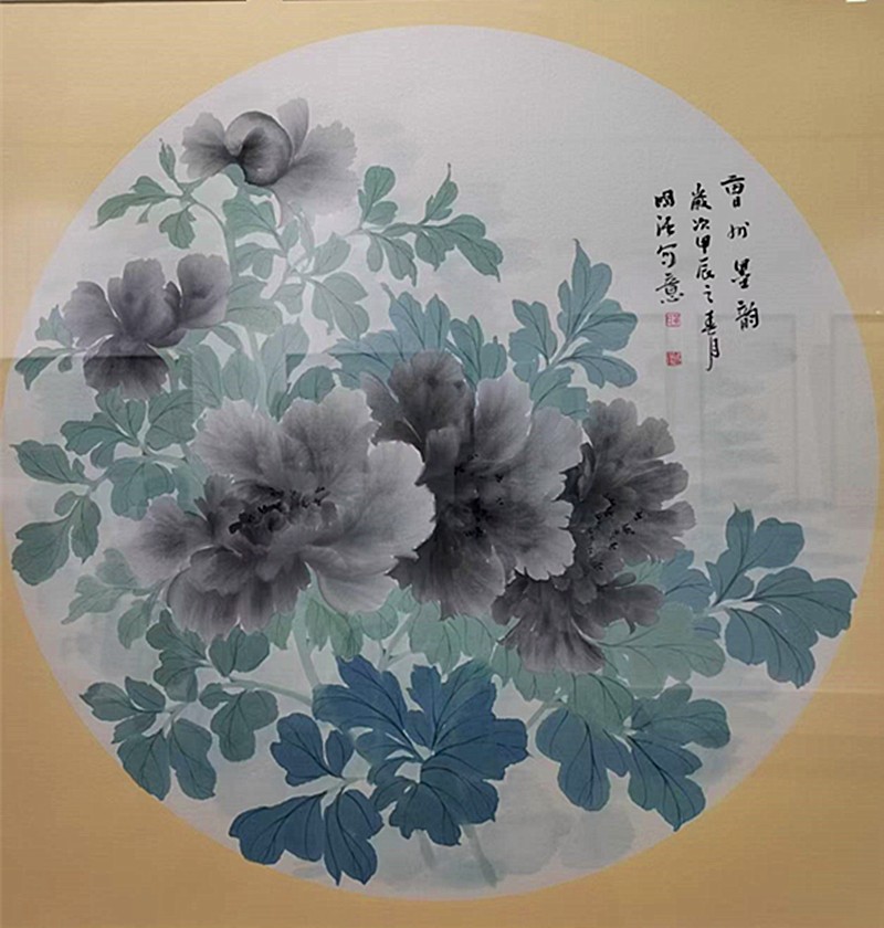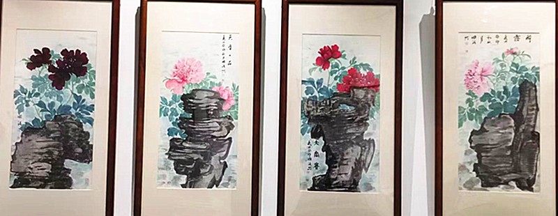于曹州牡丹园国花馆三楼展厅,黄国强牡丹芍药作品展正在展销。