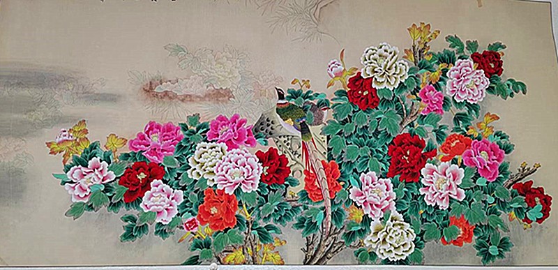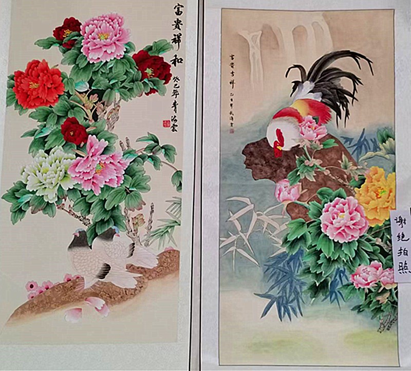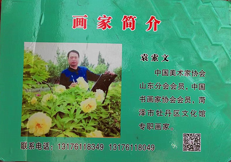 于曹州牡丹园国花门北邻,山东省美协会员袁索文作品展正在展销。