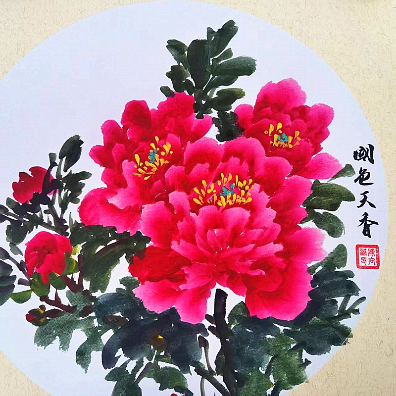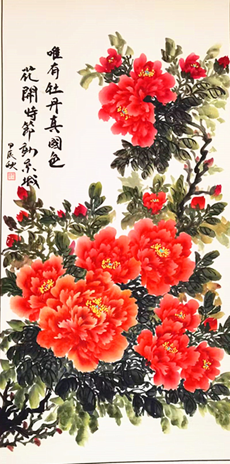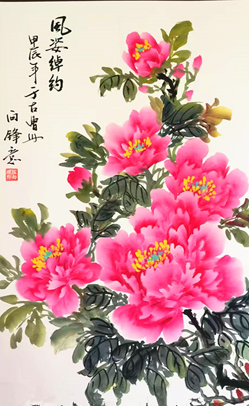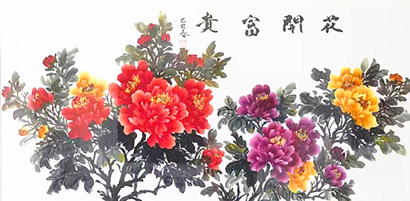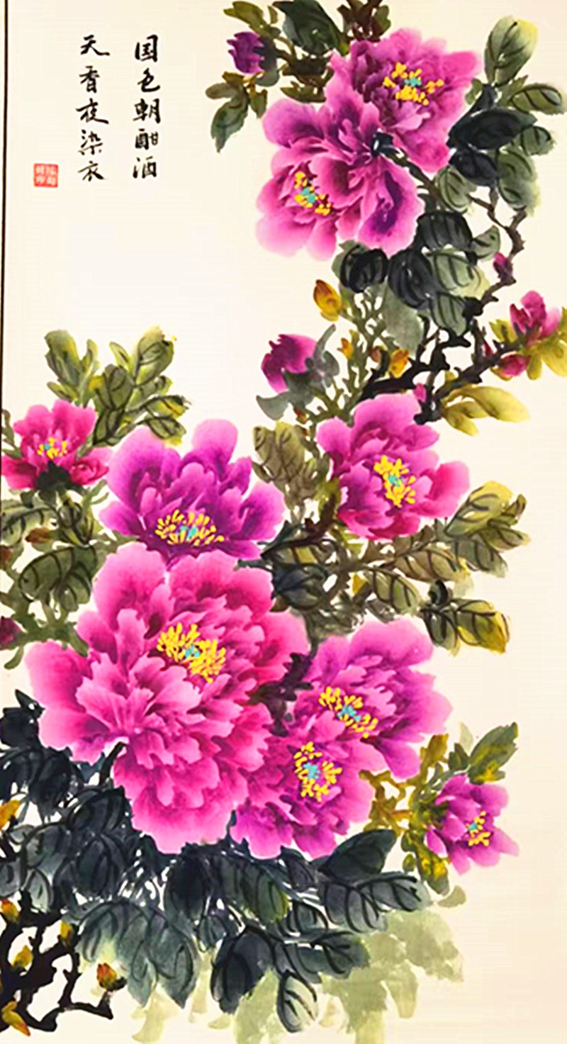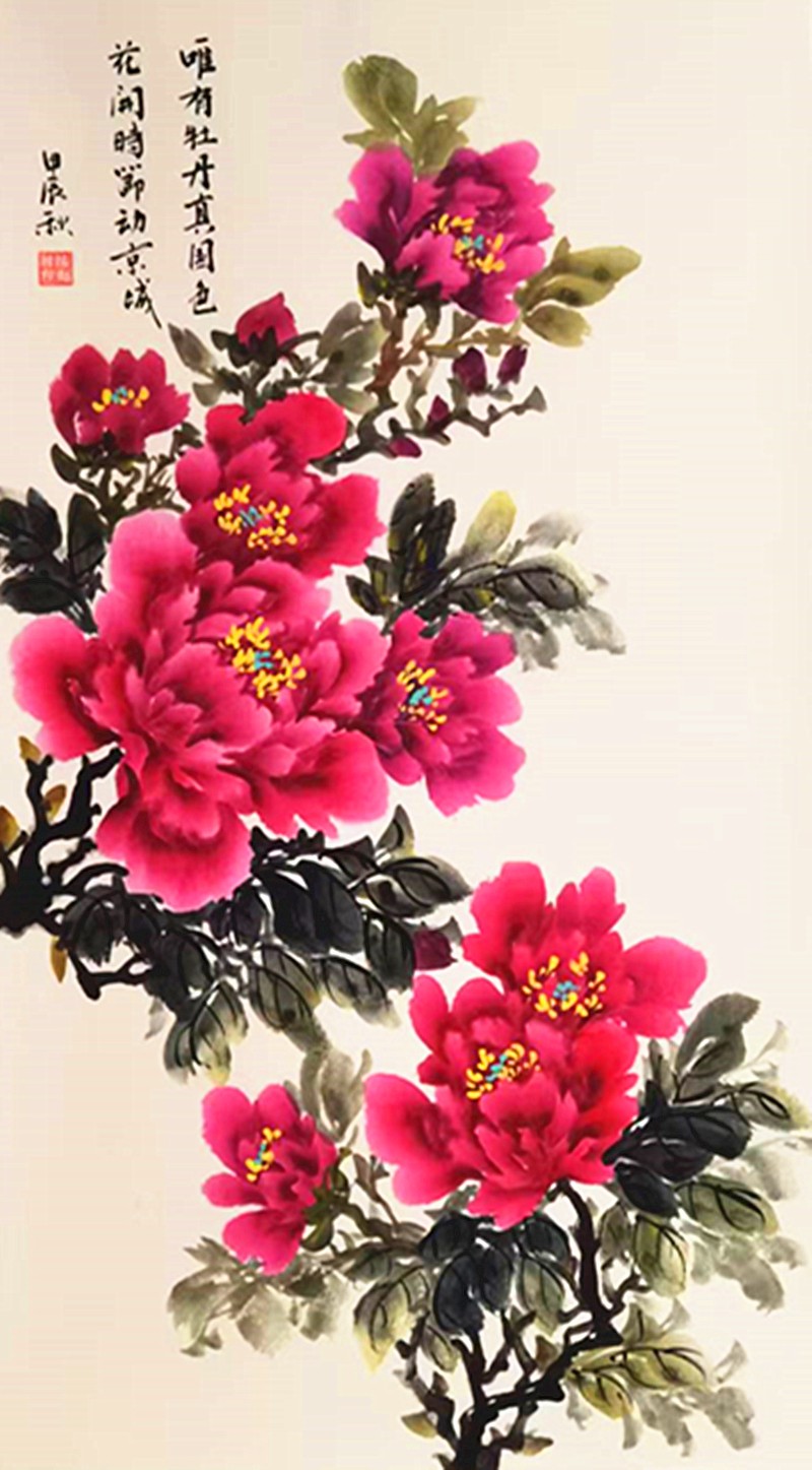 自小热爱画画,那时还不懂什么叫做艺术,只知道在纸上用笔还原身边的花草人物。这份简单的热爱,经过岁月沉淀,笔墨挥洒间,于国画艺术中魅力尽显。对国画的热爱让她逐渐在平淡的生活中找到生命更深层的意义,在对国画艺术的探索中完善自己。尤其对于热爱的牡丹,不断的磨炼绘画的技巧和造型的构造,开拓属于自己的国画风格。或绽放或花蕊,无论是什么姿态的牡丹,在她的笔尖下都熠熠生姿,缤纷绚烂笔走龙蛇见真章,墨香浸骨绘芬芳。红妆绿袍配得宜,愿此牡丹,岁岁华茂,永驻纸上。