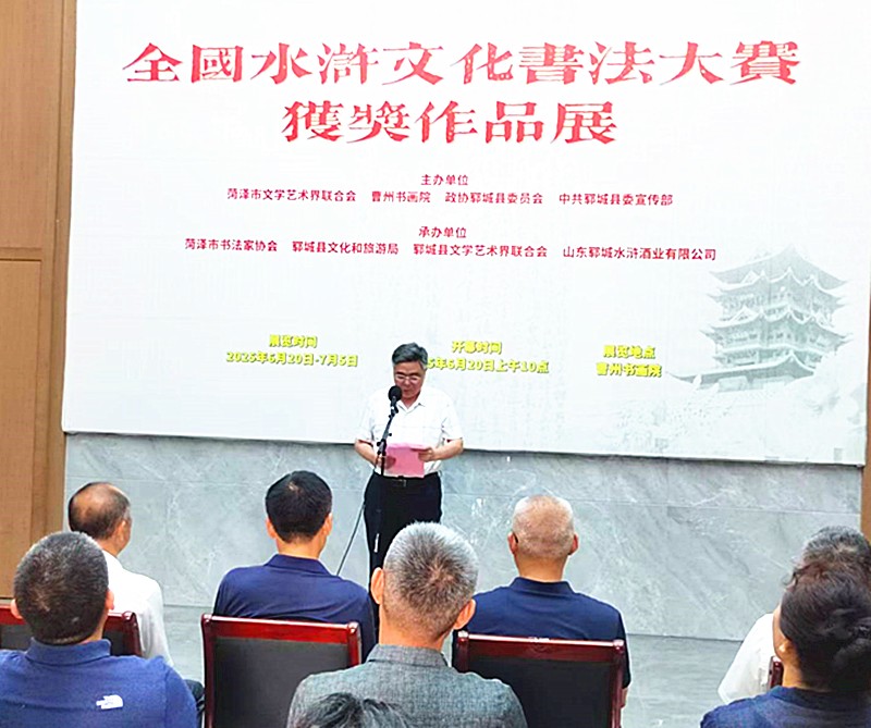 6月20日,由菏泽市文联、曹州书画院、郓城县政协、郓城县委宣传部联合主办,菏泽市书法家协会、郓城县文旅局、郓城县文联、山东郓城水浒酒业有限公司承办的2025年全国水浒文化书法大赛获奖作品展,在曹州书画院隆重开幕。本次展览自去年9月启动,得到了全国书法界同仁大力支持,北京、上海、四川、浙江、甘肃、河南、辽宁等15个省市及山东省各地市作者积极响应,投稿踊跃。共收到来稿500余件,其中中书协会员39人参加,年龄长者79岁,小的刚满12岁,且女性作者占有较高比例。数量之大、精品之多、影响之广,是此活动举办三届以来空前的,充分反映出书法艺术创作的繁荣景象。菏泽市书法家协会组织评审专家,本着公平、公正、公开的原则,评选出等级奖作品36件、入展作品72件。