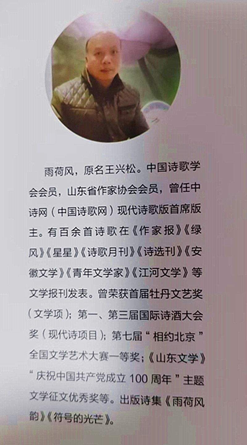 雨荷风,原名王兴松。中国作协会员,中国诗歌学会会员,山东省文艺评论家协会会员。曾任中诗网(中国诗歌网)现代诗歌版首席版主。有百余首诗歌在《作家报》《绿风》《星星》《诗歌月刊》《诗选刊》《安徽文学》《青年文学家》《江河文学》等文学报刊发表。曾荣获首届牡丹文艺奖(文学项);、第三届国际诗酒大会奖(现代诗项目);第七届“相约北京”全国文学艺术大赛一等奖;《山东文学》“庆祝中国共产党成立100周年"主题文学征文优秀奖等。出版诗集《雨荷风韵》《符号的光芒》《那时花开》。