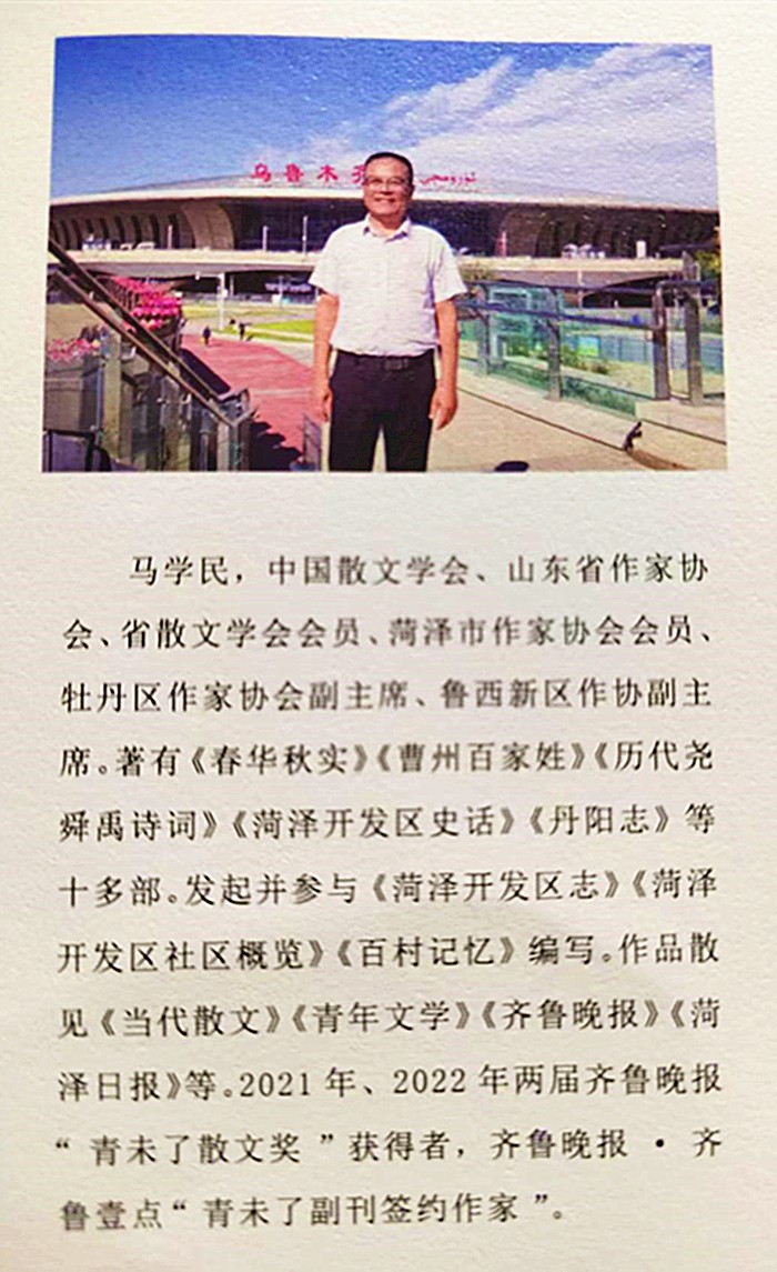 马学民,中国散文学会、山东省作家协会、省散文学会会员、菏泽市作家协会会员、牡丹区作家协会副主席、鲁西新区作协副主席。著有《春华秋实》曹州百家姓》历代尧舜禹诗词》《菏泽开发区史话》《丹阳志》等十多部。发起并参与《菏泽开发区志》《菏泽开发区社区概览》《百村记忆》编写。作品散见《当代散文》《青年文学》《齐鲁晚报》《菏泽日报》等。2021年、2022年两届齐鲁晚报“青未了散文奖”获得者,齐鲁晚报·齐鲁壹点“青未了副刊签约作家”。
