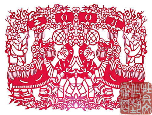 剪纸又叫刻纸,是古老的民间艺术之一,它是一种镂空艺术,其在视觉上给人以透空的感觉和艺术享受。这种民俗艺术的产生和流传与农村的节日风俗有着密切关系,人们把美丽鲜艳的剪纸贴在雪白的墙上或明亮的玻璃窗上、门上、灯笼上等,节日的气氛便被渲染得浓郁喜庆。