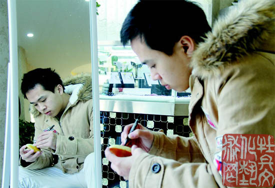 莫权成家在广东省东莞市,自幼喜爱美术。18岁那年,他为了梦想,只身一人到苏州市学习琥珀雕刻技艺。学了3年,莫权成才出师,之后成立了自己的工作室。一个月前,被现在的老板刘伟“挖”到了菏泽。