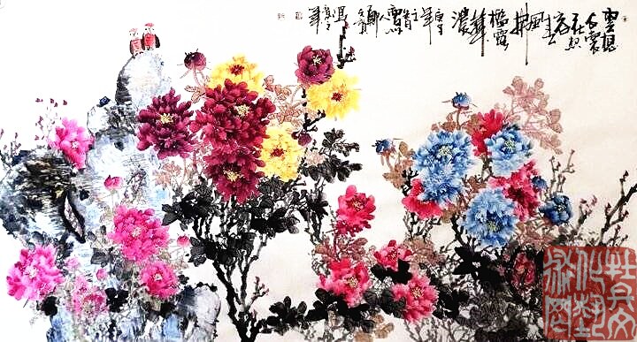 如此势头,我们从郑克实先生的《天香迎富贵》《富贵满堂红》《花开时节动京城》及一些长卷牡丹图中,略窥一二。但见这些画中之牡丹,黄似金,粉似霞,白似玉,红似火,黑似墨,绿似翡翠,紫似葡萄,大有 “云想衣裳花想容,春风拂槛露华浓”之风姿。细细品味,但见画中有老枝,有新芽,有丹石,有雀鸟,有蜂有蝶,有色有香,有觉有味,有风有雨。风在何出呢?你看那牡丹与枝叶,婷婷袅袅往一则微微倾斜,这不正是风吗?雨在何出呢?自然是在郑克实先生的《谷雨富贵图》中。