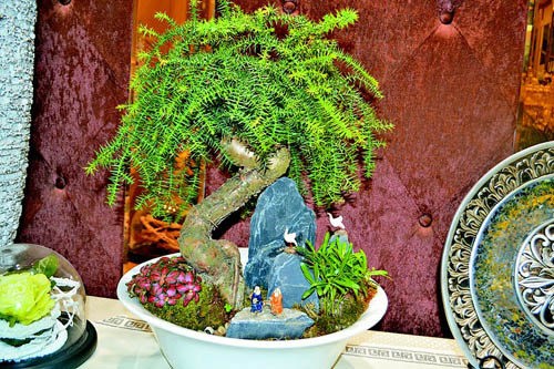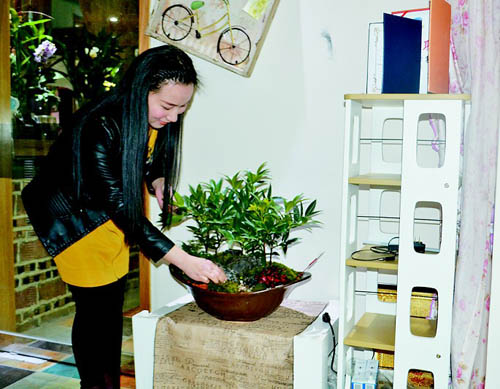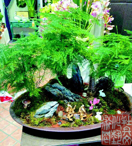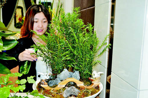 “组合盆景集天然美和工艺美于一体,搭配各种小植物,体验一花一世界的独特意境,特别适合现代生活。”盆景达人朱青说,组合盆景对居室的美化,对人的性情陶冶都有很大的作用。