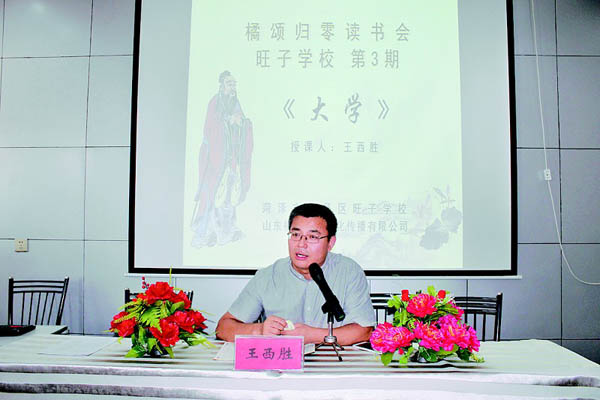 7月28日,橘颂归零读书会在牡丹区旺子学校举行,蓝态幸福文化公益基金会特聘讲师、山东橘颂归零文化传播有限公司文化顾问王西胜对儒家《四书》中《大学》的部分篇章进行了精彩解析。课堂上座无虚席,上百名市民参加了本次读书会。