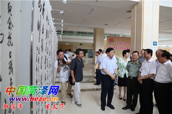 8月18日上午,“菏泽市纪念人民抗日战争暨世界反法西斯战争胜利70周年诗词书法大展”在市图书馆开展。该活动由菏泽市委宣传部、市文联、曹州书画院主办,菏泽市书法家协会、菏泽市诗词学会、菏泽市图书馆承办。市领导刘勇、王永江、丁志刚、黄秀玲,菏泽军区司令员张廷善参加活动。