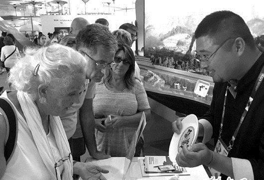 在东明粮画展台,粮画技艺传承人韩国瑞在为意大利游客展示东明粮画的制作过程。韩国瑞告诉记者,在意大利并没有粮画这个画种“粮食是用来吃的,怎么能用来作画?”这是很多国外游客对他提出的问题。几位游客止不住好奇心,亲手拼了一幅。韩国瑞说,展演过程中,他还收了几个洋徒弟。