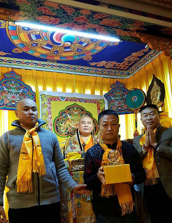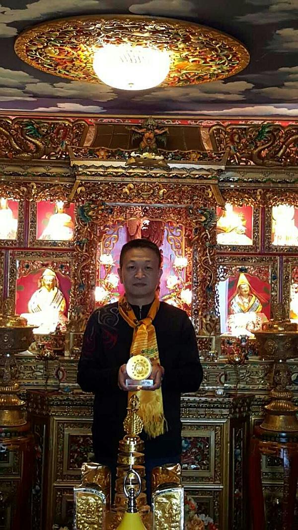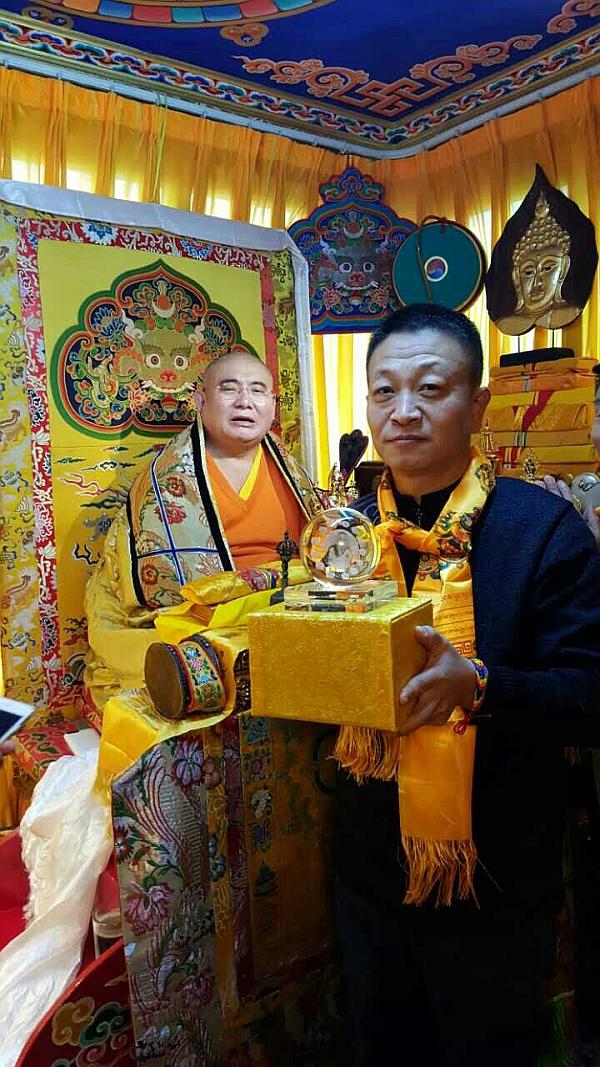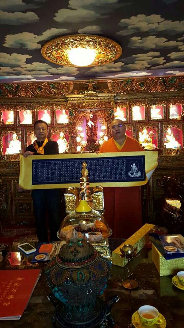 蒙古国活佛金刚法王,为答谢书法家肖旭东为其名作《八字经》书写的小楷长卷,长15米,宽35厘米,在日内瓦联合国万国宫展示并收藏。11月21日上午在北京万佛堂召见肖旭东一行,并赠送水晶法王头像 以示留念。
