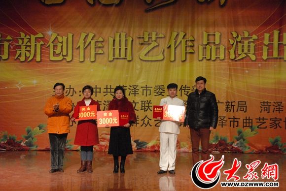 大众网记者了解到,菏泽市新创作曲艺作品演出决赛由菏泽市委宣传部主办,市文联、市文广新局、菏泽医学专科学校承办,在为期一天的决赛中,来自全市的23支曲艺代表队和个人进行角逐,终,由菏泽市艺术馆选送的山东琴书《老农卖瓜》、成武县选送的坠子《文亭青松祝亚丁》、郓城县选送的山东琴书《剪窗花》获得一等奖,鄄城县选送的山东琴书《仨儿争爹》、《解疙瘩》以及成武县选送的《老农卖瓜》等5个曲艺作品获得二等奖,市艺术馆选送的坠子《上岗》等7个单位选送的作品获得三等奖,东明县选送的小戏曲《考儿媳》、牡丹区选送的戏曲表演唱《剪窗花》等8个曲目获得优秀奖。