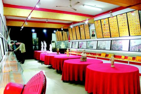 博物馆里陈列着近万枚像章、罗列满庭的抗战时期红色文物及3000多件以红色文化为主题的诗、书、画、像。