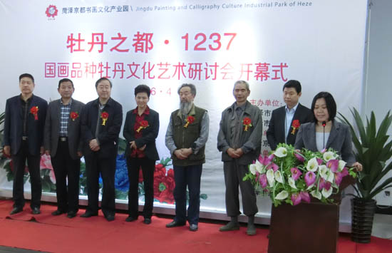 4月16日,牡丹之都 1237国画品种牡丹文化艺术研讨会在菏泽京都书画文化产业园开幕。菏泽市牡丹产业化办公室主任朱瑞军出席开幕式并讲话。菏泽高新区、菏泽市个体经济服务中心、菏泽市新闻文化传媒中心,牡丹区委宣传部、区文联、区工商联、菏泽书画家联谊会等单位负责人,全国画家、企业家、代理商及社会各界人士200余人出席本次活动,观赏了菏泽传统工笔牡丹画家李振元先生历时四十载工笔绘就的1237个品种的牡丹图谱。 研讨会上,来自全国各地的画家、企业家、代理商、新闻界代表,对李振元先生根植牡丹田,辛勤耕耘,坚持不懈进行工笔牡丹创作的精神尤为钦佩,对他依照牡丹的十大花型、九大色系、绘出的1237个品种精美牡丹画卷给予极高评价,是牡丹王国的 清明上河图 画卷。 研讨会后,1237国画品种牡丹作者李振元先生和菏泽部分书画家挥毫泼墨祝贺本次研讨会召开。菏泽京都书画文化产业园与代理商签订了一批1237国画品种牡丹销售合同、协议和意向书。 菏泽京都书画文化产业园负责人董玉忠表示,该国画品种牡丹是菏泽独有资源的产生品、艺术品和文化品,能代表菏泽牡丹形象。下一步,将加大力度宣传和推介好国画品种牡丹,为菏泽牡丹走出菏泽、走向世界搭建好平台,做大做强这一产业,为菏泽经济、文化发展做出更大贡献。