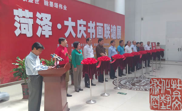 5月21日,菏泽·大庆书画联谊展在市博物馆开幕。此次书画展由市中华文化促进会、市齐鲁文化促进会、市政协书画院和大庆市齐鲁文化促进会共同主办。大庆市政协副赵希江,市人大常委会副主任丁志刚、市政协副付守明出席活动并参加书画联谊展剪彩仪式。