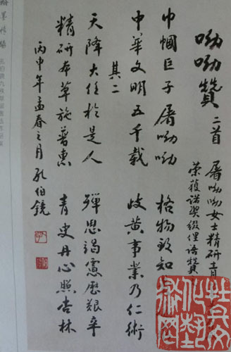 为庆贺孔伯镜先生90岁生日华诞,日前《翰墨情缘》---孔伯镜九秩华诞书法作品集出版。该作品集由书法家李荣海、于法杰、张剑萍、谢孔宾、王宗普先生任顾问,美术家协会理事、书法家协会理事、中央机关书画协会副、友联画院常务副院长、研究馆员李荣海先生封面题字,作家协会会员、高级编辑赵统斌先生作序,东方龙(官军)主编。