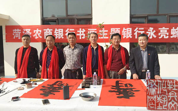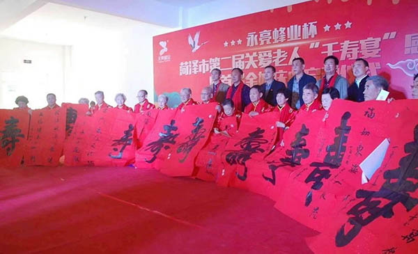 10月28日,在由菏泽市文明办、菏泽市民政局、菏泽市老龄委、报业集团主办,菏泽市永亮蜂业集团承办的久久重阳节菏泽市永亮蜂业杯第二届关爱老人“千寿宴”暨首届金婚庆典启动仪式上,菏泽农商银行书画主题银行的书法家曹中华、刘中峰、藏现军、刘中山在南城支行张靖武同志的带领下,满怀着对老人们的尊重之情,挥毫泼墨书写一副副寿书法作品,代表菏泽农商银行向十五位贫困老人和九对金婚老人每人送去一副精美的寿字作品,并祝老人们节日愉快、身体健康、阖家欢乐、万事如意。
