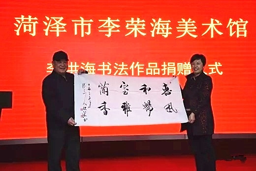 李洪海先生是书法家协会第五、六届理事,享受国务院特殊津贴。本次展出的80余幅书法作品,紧紧把握时代节拍,精选历代名人赞颂祖国的壮丽诗篇和精美联句,涉及祖国名山大川、人文景观和旅游胜境。书法作品积多年学承,形成内紧外拓、疏密相间、骨势秀逸、体势俊美的书风。书法篆刻作品 广为流传,被中央办公厅、国务院办公厅、中央军委办公厅等单位收藏。主要出版作品有《红楼梦诗词歌赋钢笔书法》、《诸葛亮前后出师表》、《李洪海斗方书法作品集》、《翰墨系海疆》、《李洪海学录雷锋日记》、《李洪海书法美术精品汇编》等。曾荣获“献爱心优秀人民艺术家”、“全军学雷锋先进个人”等荣誉称号。李洪海表示:“文化大繁荣,书法进万家,书法家义不容辞,责无旁贷”。他为表达对菏泽市李荣海美术馆的支持,还捐赠两幅精心创作的四尺书法作品,市委宣传部常务副部长马喜荣同志接受捐赠并颁发收藏证书。
