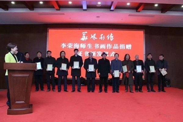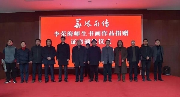 参展作者:李荣海、丁志刚、张天佑、徐方闻、李涛、陈玺东、牛广成、荆匡胤、张岩、殷萧华、刘石、庞成勇、鲁世杰、孙振。专程从全国各地来菏参加展览开幕式的领导嘉宾美术家协会分党组副书记 陶勤女士书法家协会分党组副书记、秘书长 郑晓华先生书法出版社社长、书法家协会理事 李有来先生山东省省委宣传部副巡视员 张卫华同志山东省书法家协会副 菏泽市书法家协会 曹钰先生山东省美术家协会秘书长 魏百勇先生潍坊青州中晨集团董事长 赵淑华女士我市出席本次展览的领导同志们有 菏泽市政协 单立新同志菏泽市人大常委会副主任 丁志刚同志菏泽市人大常委会副主任 汤建梅同志菏泽市党组成员 鲁志成同志菏泽学院原党组书记 张存金同志菏泽学院副院长 黄济民同志菏泽市文化和旅游局党组书记 李贵福同志菏泽市李荣海美术馆名誉馆长 李荣海先生以及我市市直相关部门负责同志,艺术界、企业界和新闻媒体的朋友们共计150余人。 菏泽市人大常委会副主任汤建梅、菏泽市文化和旅游局党组书记李贵福、菏泽市李荣海美术馆名誉馆长李荣海向参展艺术家们颁发收藏证书。参展艺术家代表丁志刚先生向菏泽市图书馆捐赠展览作品集,菏泽市图书馆馆长张朝永同志接受捐赠。李荣海先生向菏泽学院捐赠展览作品集,菏泽学院副院长黄济民同志接受捐赠。