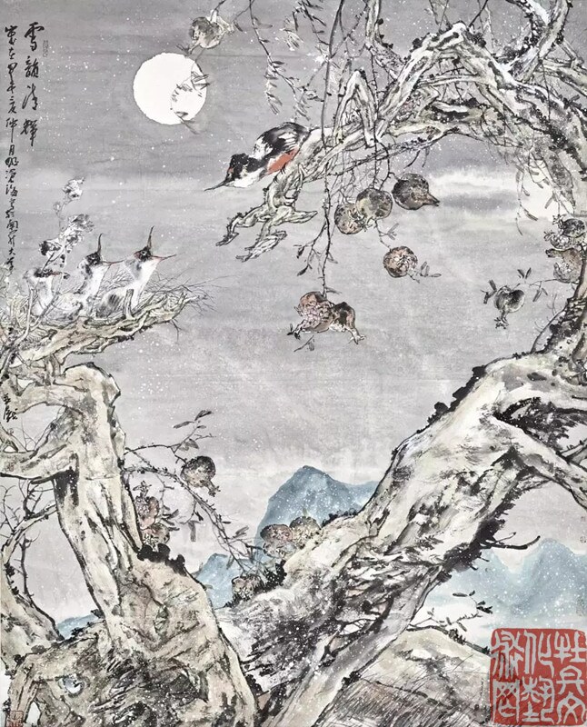 尹沧海教授身居讲台数十余载,依托南开大学人文学科的综合资源,将培养以学为主、以术为用的艺术人才作为己任。通过言传身教,其指导学生为人应当至恭、至诚、至真、至善;作文应当中庸峻极,大块文章;从艺应当中正平和,兼收并蓄,进行自由、质朴的表达。在尹沧海教授谆谆教诲之下,众多学子学有所成。此次展出的学生作品题材丰富、风格多样,山水、花鸟、人物兼有,写意、工笔俱全,或着力一科,旨于深入钻研,或诸科交叉,寻求内在互补,表现了对于“意象造型”美学理念的认知与领悟。这些风华正茂的作品,可谓是对南开大学多年艺术教育成果的一次集体展示。