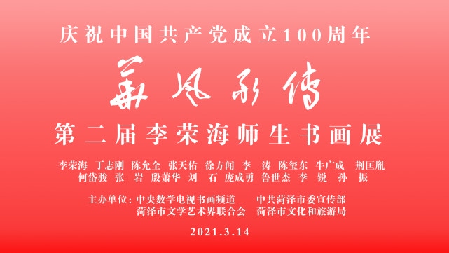 2021年3月14日,第30届菏泽国际牡丹文化旅游节开幕在即,在这美好时节,由中央数字电视书画频道、菏泽市委宣传部、菏泽市文学艺术界联合会、菏泽市文化和旅游局主办,菏泽市李荣海美术馆承办,冠泽置业有限公司支持的《庆祝成立100周年,“华风承传"——第二届李荣海师生书画作品展》将于菏泽市李荣海美术馆开展。届时将展出精品力作书画作品100幅。