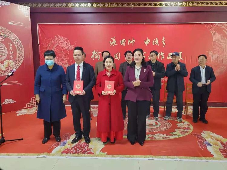 书画展上县委宣传部常务副部长、县文联杨建立宣读了为本次展出寄来祝贺作品的全国书画名家名单,原县人大常委会副主任鲍言亭介绍了张国帅、申俊青的成长经历,曹钰、张冠忠、陈成旭同志为婚礼进行了致词,县民政局局长张琇荣、县妇联郭春霞为两人颁发结婚证书。