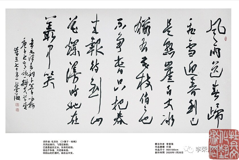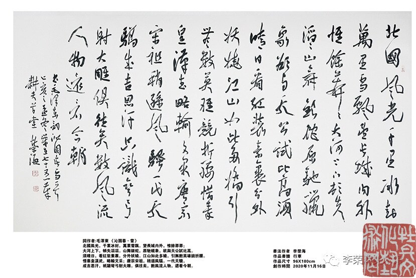 他作为一名党员,作为一名党的文艺工作者,以对党的感恩之情,对毛的敬重敬仰之情,用一年半的时间精心书法创作毛诗词76首,在庆祝成立100周年之际,向党汇报!向党献礼!由菏泽市委宣传部,菏泽市文化和旅游局、牡丹区委、牡丹区人办“还看今朝-庆祝成立100周年李荣海书诗词作品展",从诗词博大精深的内涵中,以书法这种艺术形式,潜移默化式的影响我们的党员干部群众,青年学生,再现党的光辉历程,领略党的丰功伟绩。通过读毛的诗词,看《还看今朝》党史教育片,激发观众爱党爱国的热情。菏泽市委书记张新文为展览写序,序中评价这个展览“一定是一堂举旗帜,聚民心,展形象的生动党课"。在党史教育活动中起到一堂党课作用,激发爱党爱国热情,正道前行,不忘初心,牢记使命!