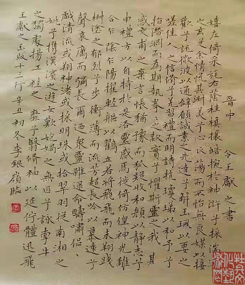 他主要擅长小楷,但他不满足,寻找机会出去看看外边的世界。2015年9月,他参加了北京传媒大学艺术创作院曾翔老师的书法高研班,当时,胡抗美老师在传媒大学有一个博士生课题班。曾、胡两个班合班上课,两个班的学员在一个教室,两位导师轮流上课,共同辅导学员。他有幸得到两位导师的教导与指点,这使他的眼界更加开阔,涉猎范围更加广泛。在北京学习的一年里,他与助教巩海涛、周治锐亦师亦友,交往甚多,他们在一起写字一起讨论一起观展,也在一起喝酒一起游玩。他学习行草,也学习篆隶,努力追求作品的厚重感,古拙感。涉猎篆刻,从篆刻中汲取营养,努力使作品具有金石味,次操刀刻石,是刻汉将军印,由于手不听使唤,直接的冲刀时有跑偏,这反到使印章天真烂漫,正契合了将军印的特点。方印就得到曾翔老师的肯定。他所临写的《圣教序》长卷,得到胡抗美老师的赞许,当胡老师看到李银岭有一方“引领居墨迹”印章时,便开玩笑地说“你就叫引领吧,引领时代潮流。”