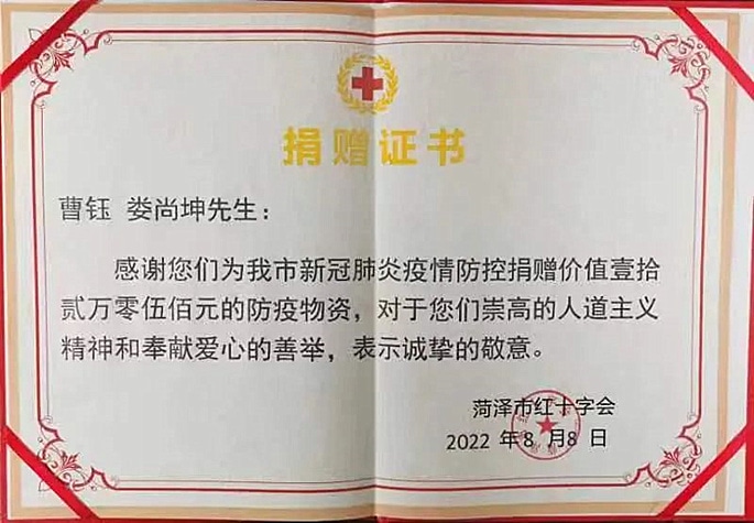 据悉,这是两人继2020年2月共同为菏泽市红十字会捐赠十万五千元防护服后又一次联手奉献爱心。