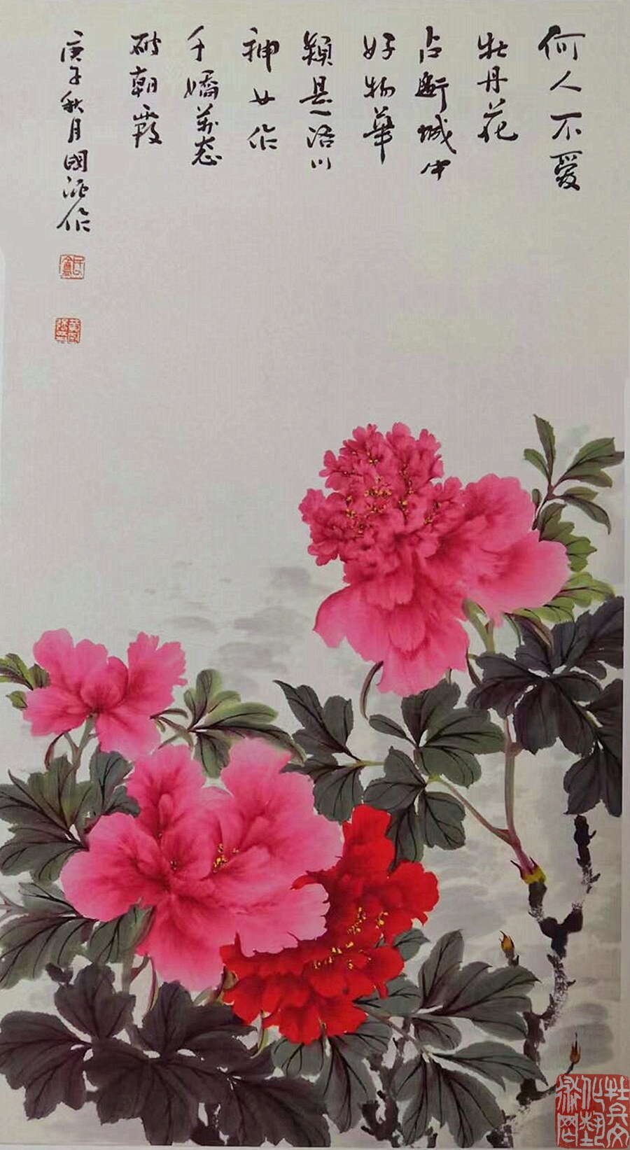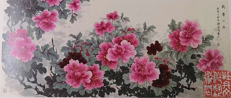 导师霍春阳先生这样点评黄国强,他是我的学生,他出生在牡丹之都--山东菏泽。他从小受到牡丹花的熏陶和影响,国强画的牡丹很有情致,也很有姿态,他的画工而不死,不板,设色很艳丽,以没骨法来写牡丹,以扎实的工笔画为基础,他把工笔画和写意结合的很巧妙,使画面很有静气,在造型上不失艳丽之姿,不失清逸之气,既庄重,又不拘谨,有境界。他的画风富丽庄重、灵动秀雅、赏心悦目,符合水墨文化“立象尽意”的笔墨精神。在造型上,在表现牡丹花的层次上、立意上,感觉画的很纯洁、很干净,没有浮躁气,格调上也不低。国强的画,在布局上、叶子的处理上还有进一步提升的空间和潜能。