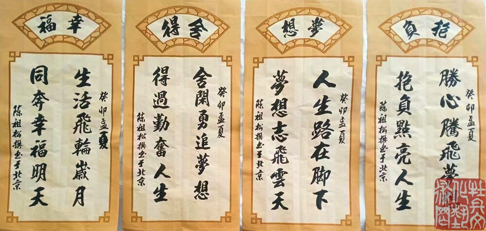 笔书励志书香醉,翰墨结缘墨彩飞。心痴书法的陈祖松正有声有色地创作流光溢彩之书法作品,尽其所能为书法事业作出可见的贡献。用传志之笔写出异彩纷呈之书法作品,弘扬国粹,点缀美丽的书法花园,靓丽千家万户;用飘香之墨书写新时代赞歌,歌颂国泰民安,为丰富万众文化生活增砖添瓦。常把心声传众耳,喜留手迹在人间。努力创作迎合新潮流鼓舞人生斗志之好作品,让大家乐观欣赏充满朝气饱含神韵之笔花墨彩,增加精神文化营养,享受书法墨香美餐。近二十年来,陈祖松用鲜活之文字创作出了几百首催人奋进之诗词和千余副激励斗志之对联,其中积德行善之格言警句赢得世人称赞。