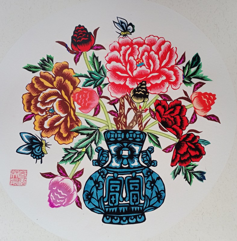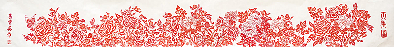 据葛秀英老师介绍,为迎接2025世界牡丹大会第34届菏泽牡丹节,多半年前就开始着手构思剪作牡丹作品,既有单色(纯红色)剪纸长卷,又有多彩套色剪纸,充分展示了剪纸牡丹非遗传承人的精湛技艺和博爱情怀。