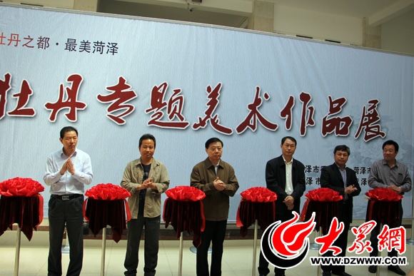 牡丹专题美术作品展开展仪式上参加活动的领导剪彩
