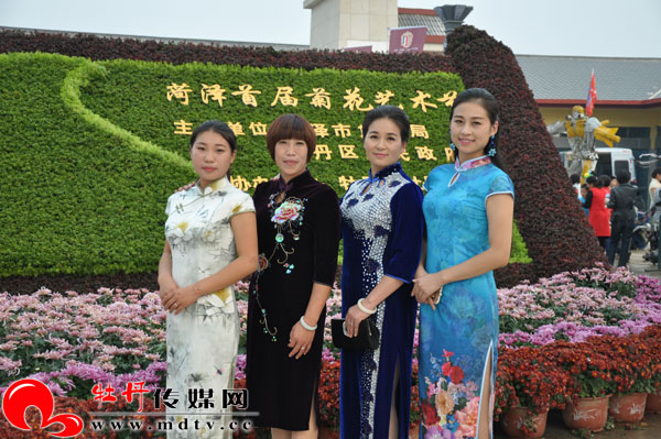 10月18日,国之韵旗袍委员会东明分会会长黄桂莲与其部分会员20余人在牡丹形象大使范雪倩的陪同下,一起参观了牡丹园及牡丹园首届菊花艺术游览节。云髻高盘、素手擎伞、旗袍裹身的旗袍爱好者,踩着优雅碎小的莲步展示风采。从传统版到现代改良版,旗袍色彩缤纷,花纹、颜色各异,衬托出女性的端庄娇美。淡雅隐逸的秋菊与优雅婉约的旗袍女子呈现出一道尽美的景致。举手投足间流露出温婉的韵味,引得游客们啧啧称美,纷纷要求合影留念。