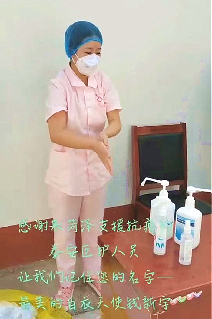 恰好在小区居住的龚局长来了,他的字写得好,让他来写吧。龚局长很乐意地拿起笔来,大家帮女孩扯平防护服。龚局长笑着问,写什么内容啊?女孩说,写“泰安 钱新宇”。